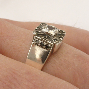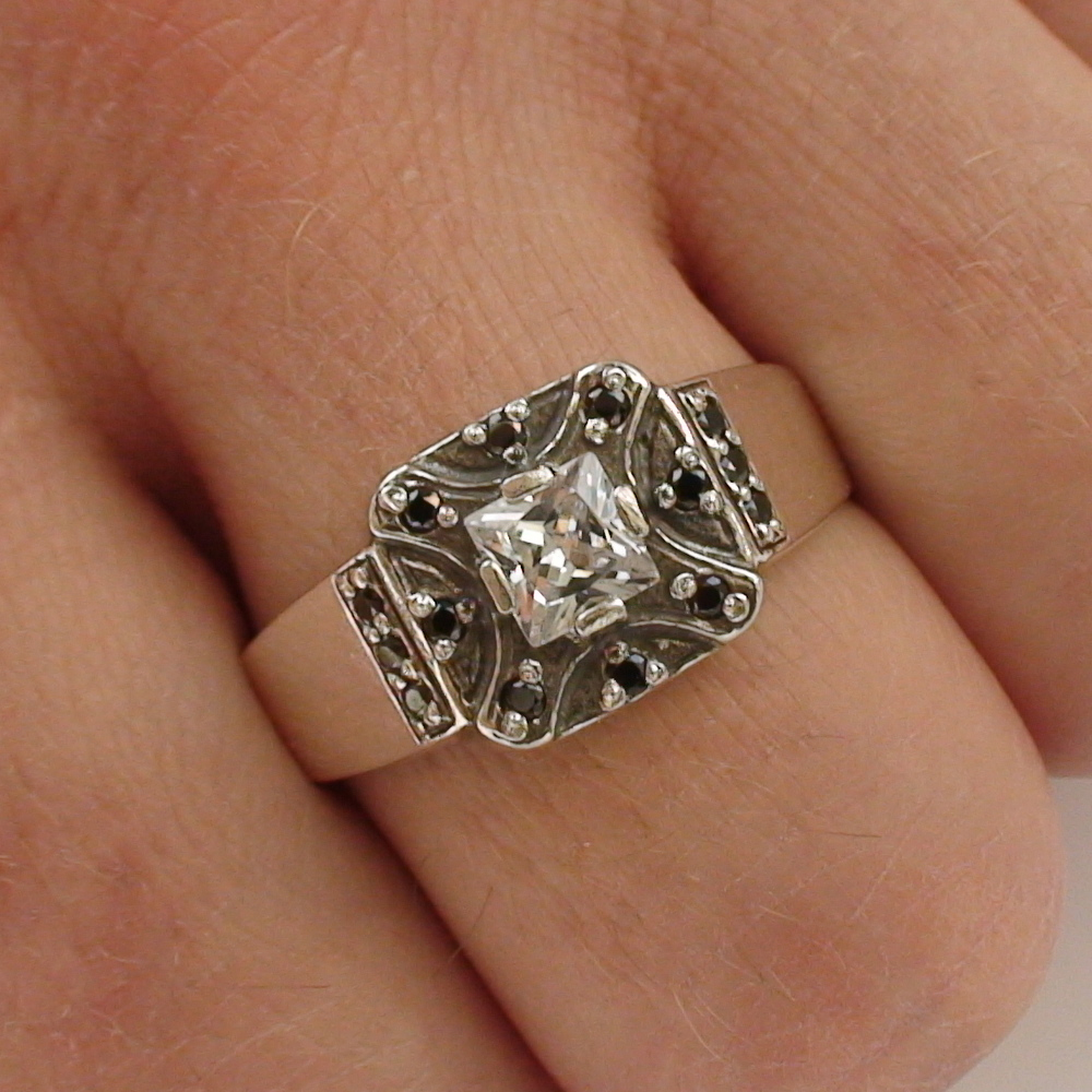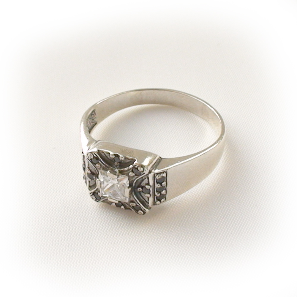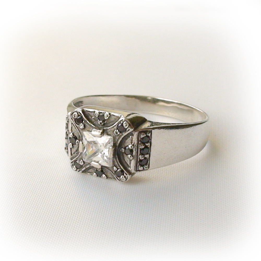Кольцо серебряное,чернение. Со вставками белым и чёрным фианитами.